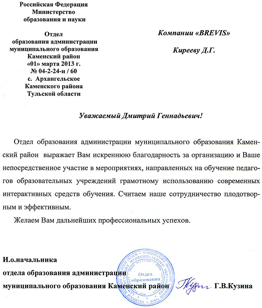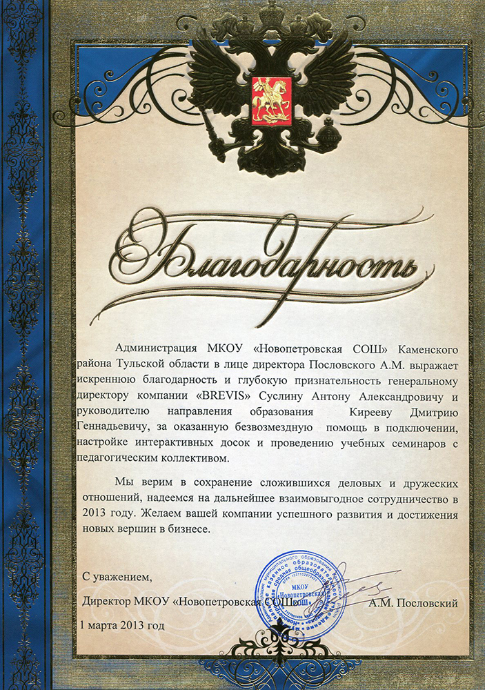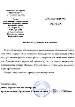 Компания BREVIS продолжает в 2013 году цикл выездных семинаров для педагогов Тульской области. 1 марта на базе МКОУ "Новопетровская СОШ" для отдела образования администрации МО Каменского района было проведено обучение по работе с интерактивным оборудованием SMART. На занятии присутствовало 43 педагога из 10 школ. Вместе мы решим любые задачи!